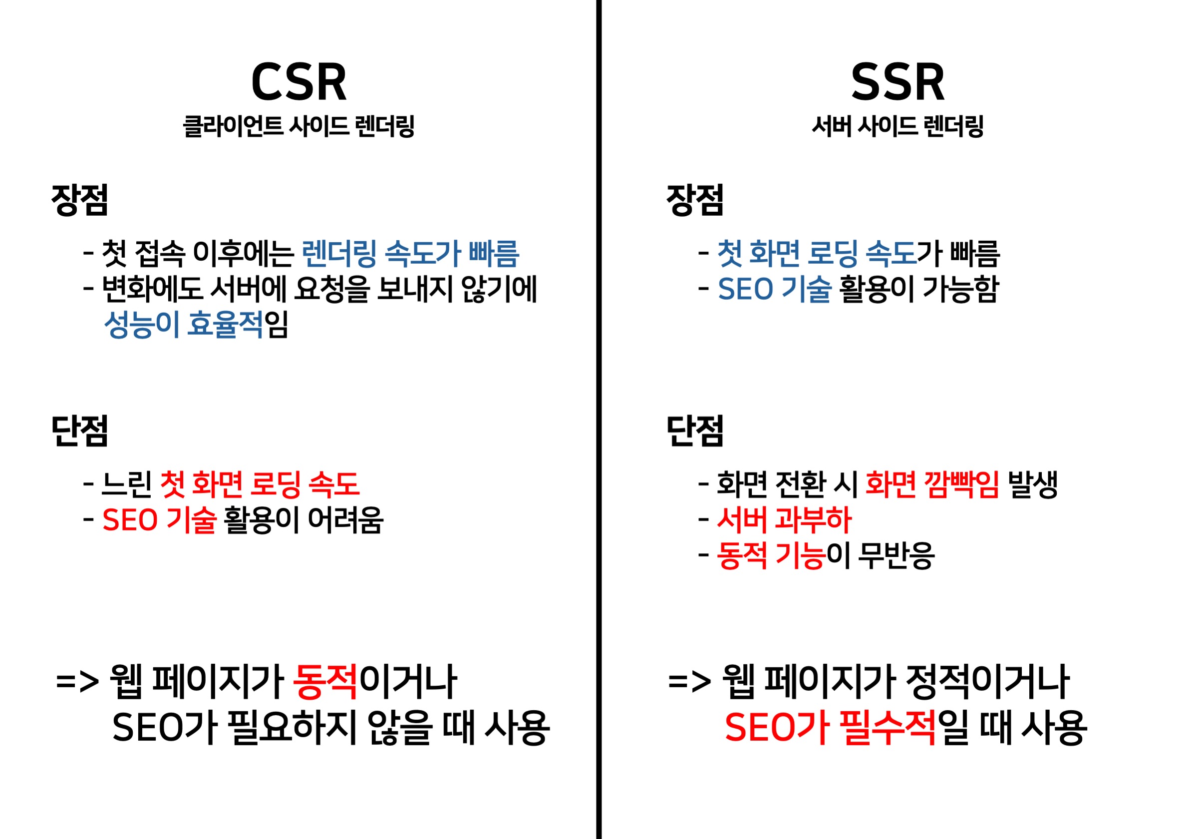 첫 접속 시 페이지를 구성하는 파일을 받아온 뒤에 Client에서 렌더링 과정을 수행하기에 첫 화면 로딩 속도가 느리다는 단점이 있다.