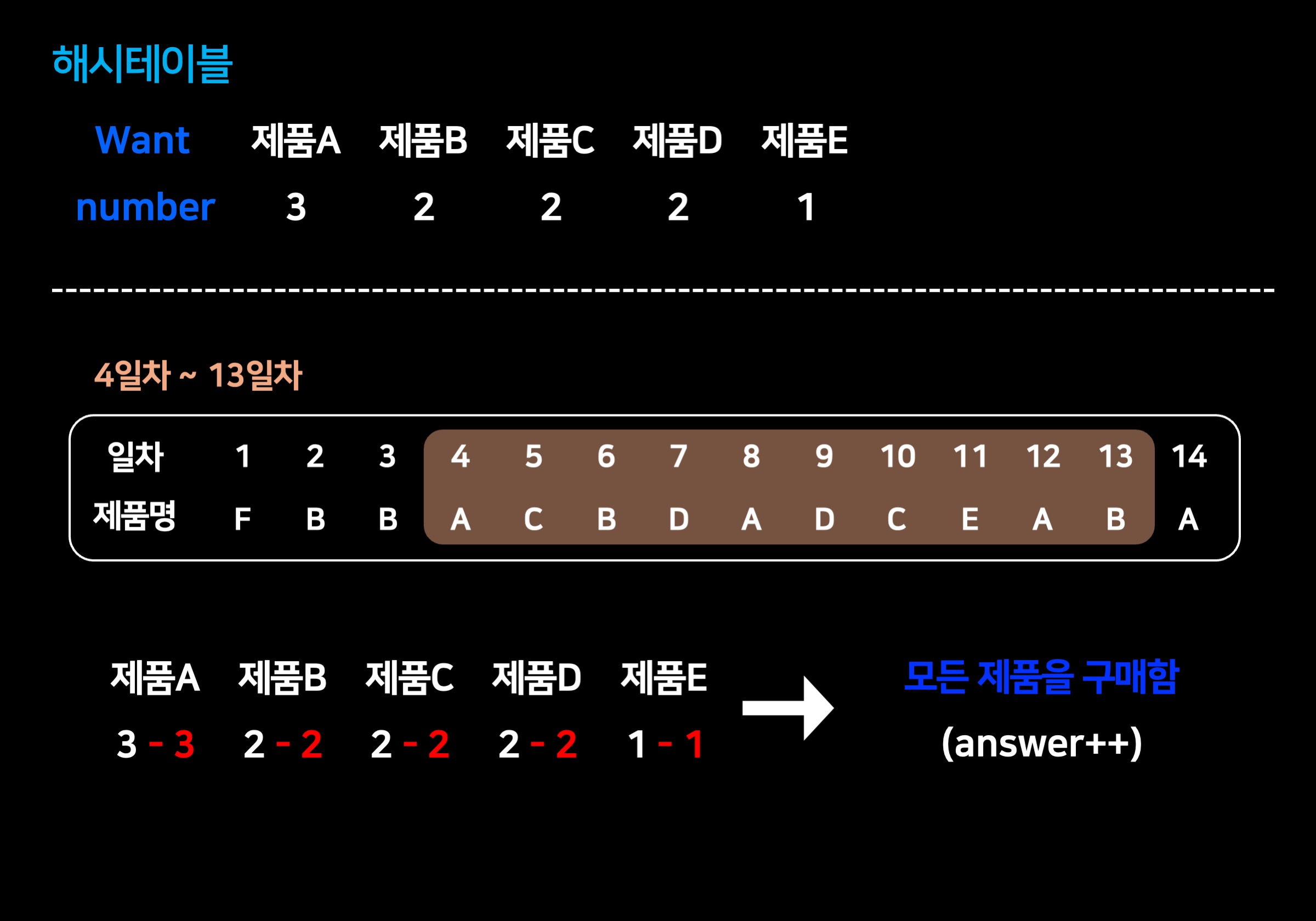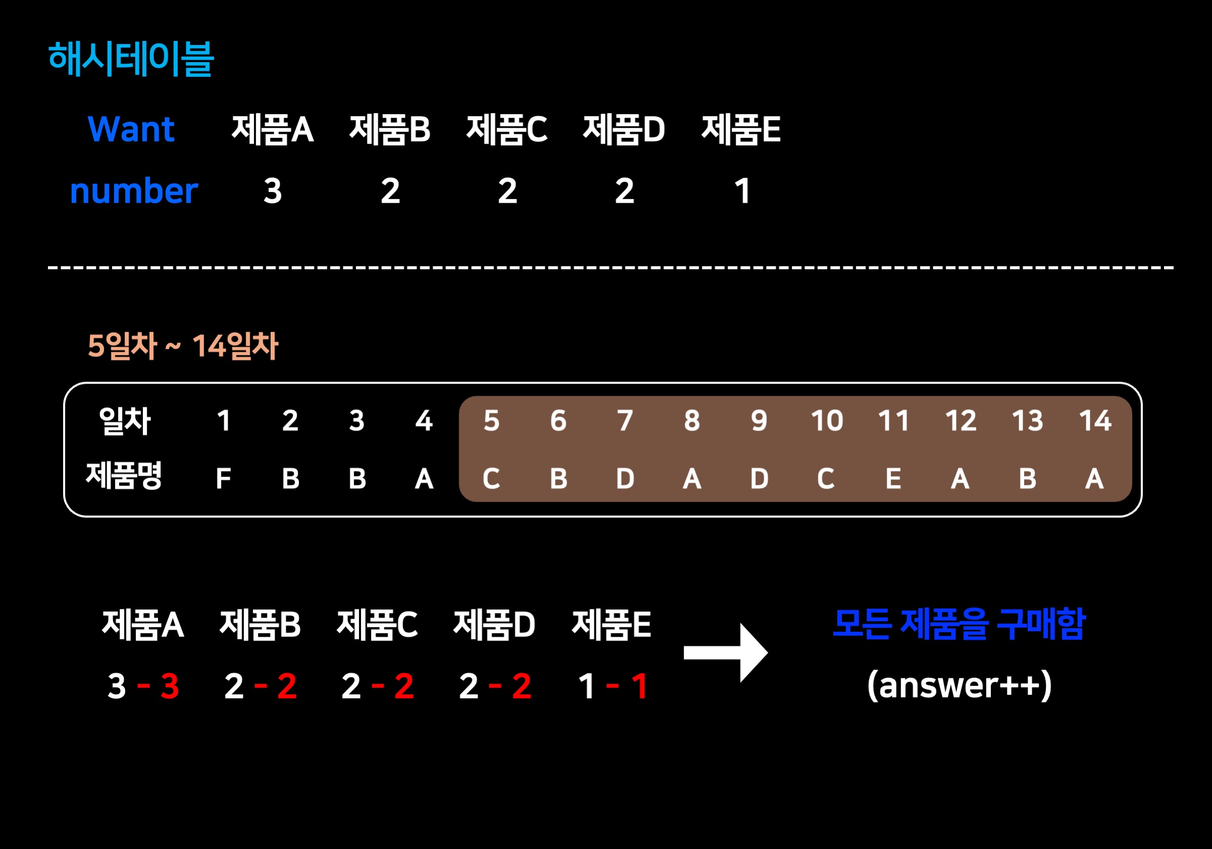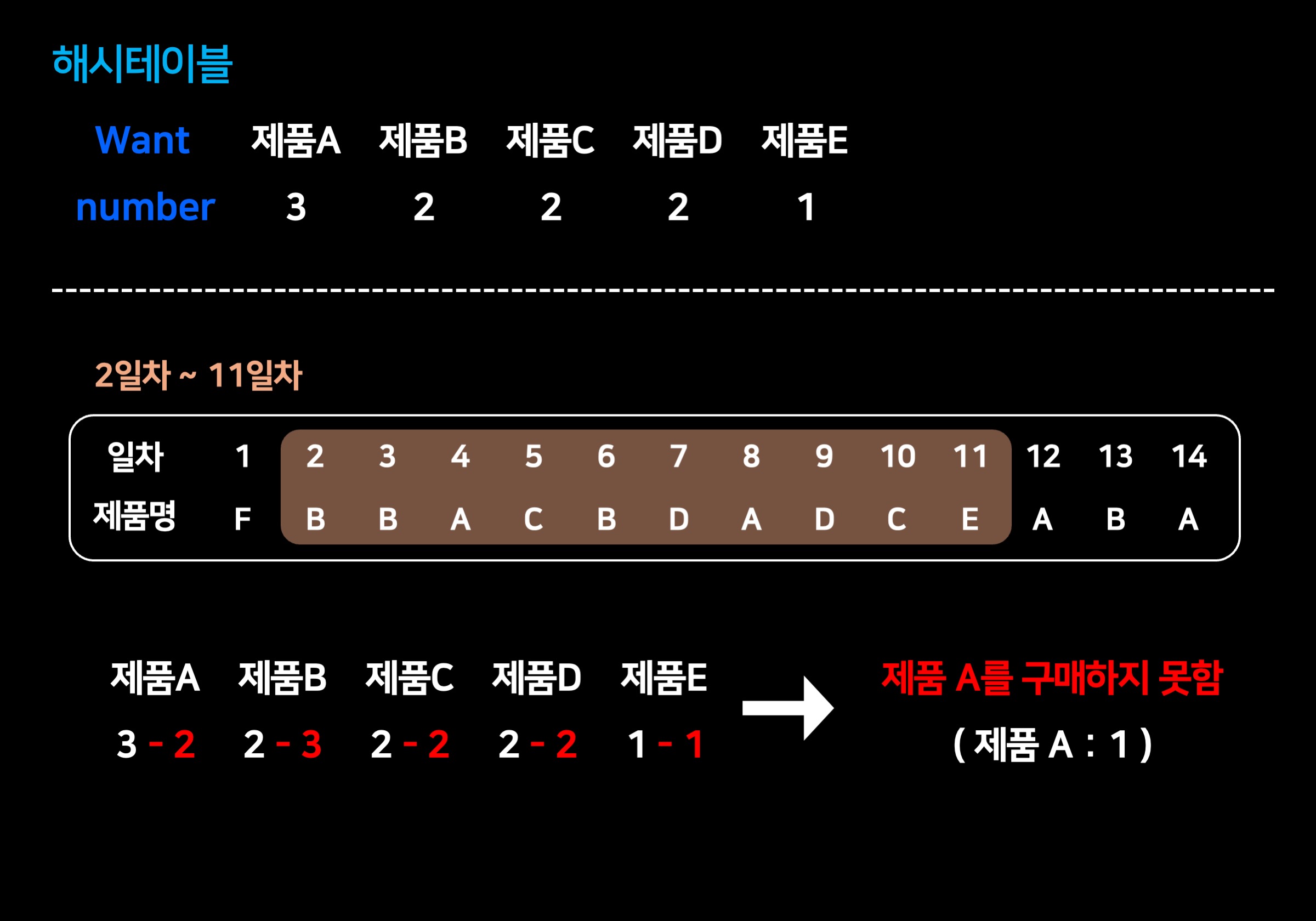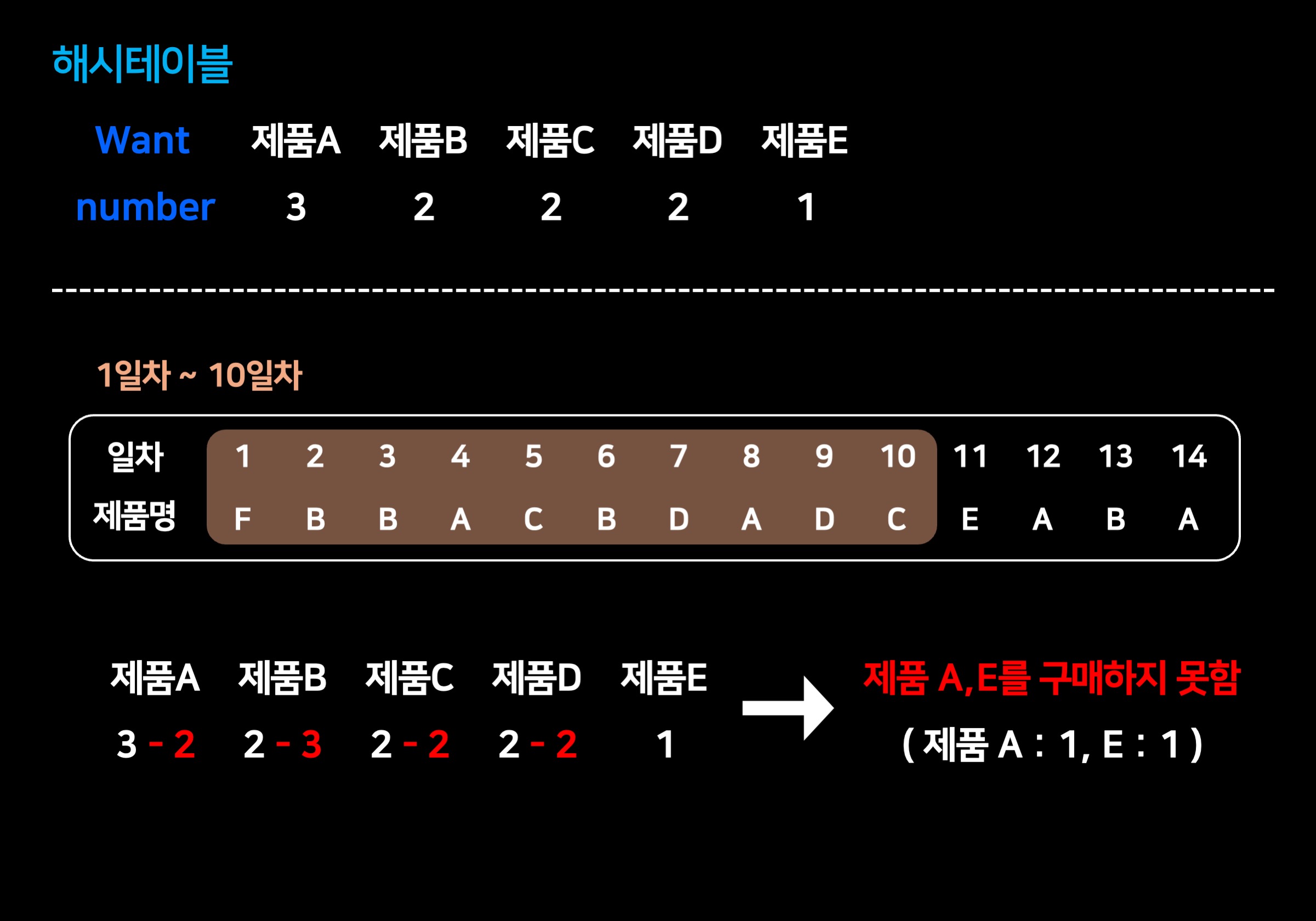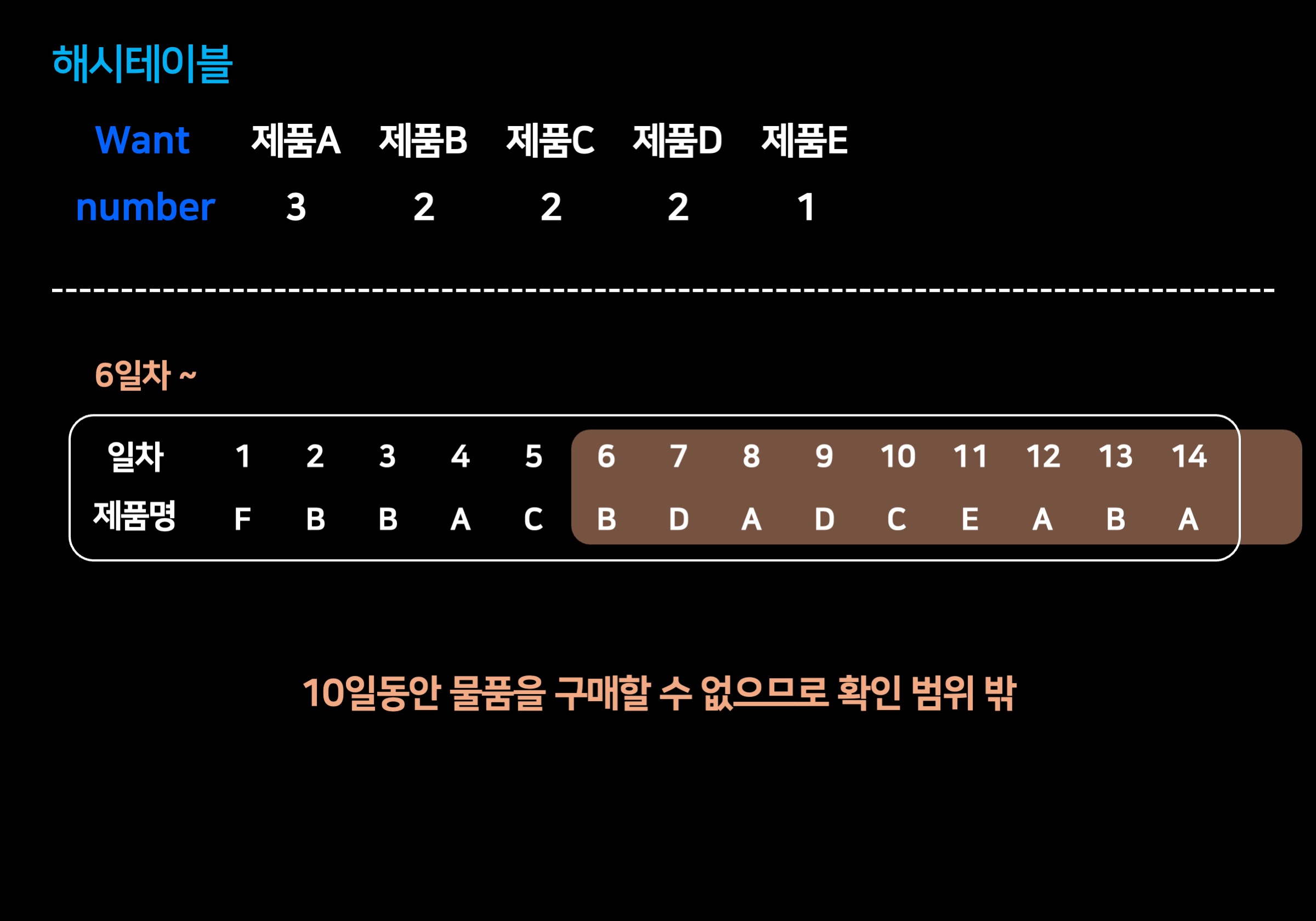 hashTable[discount[i + 9]]-- // 다음 제품은 구매 함