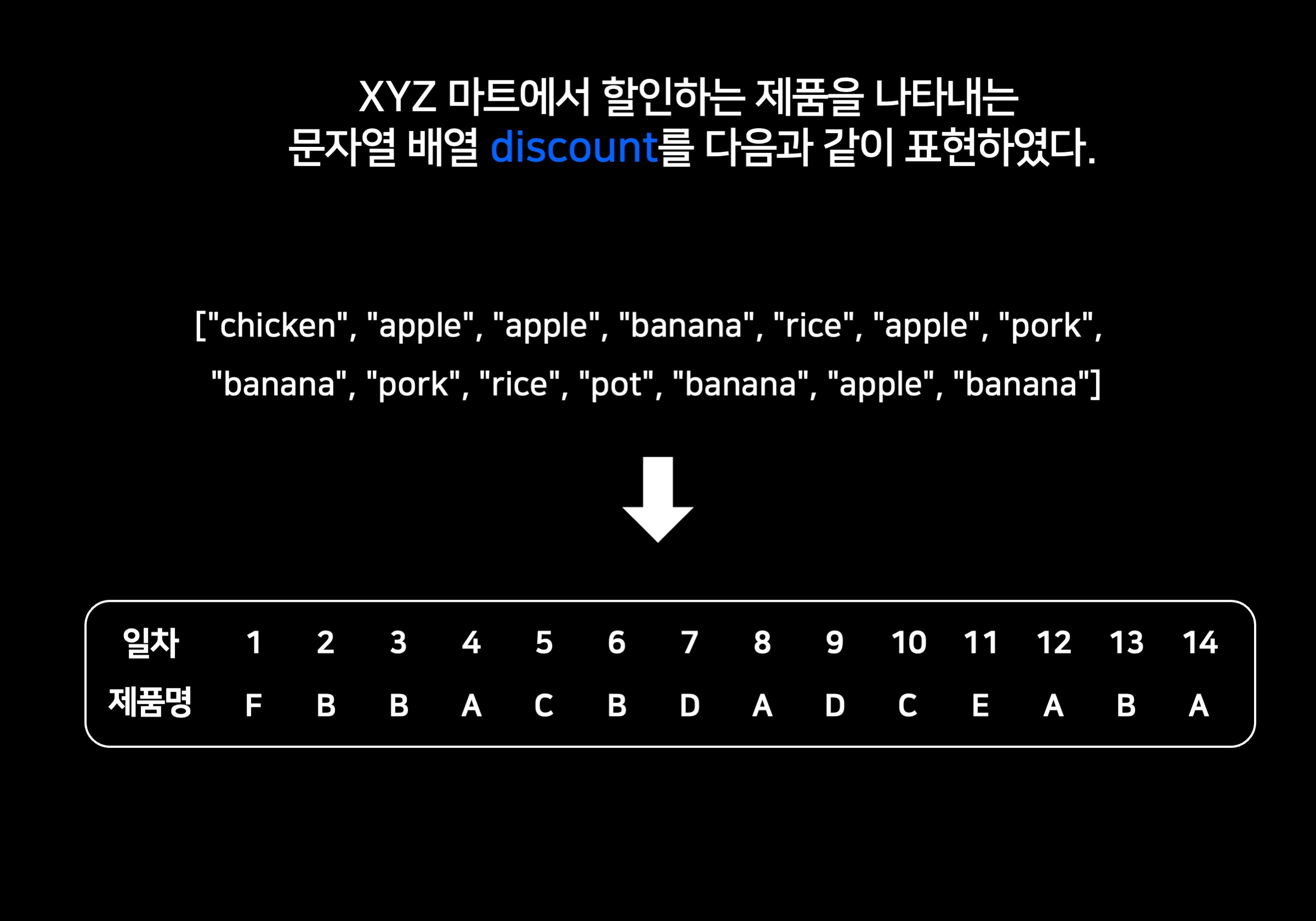 - XYZ 마트에서 할인하는 제품을 나타내는 문자열 배열 discount