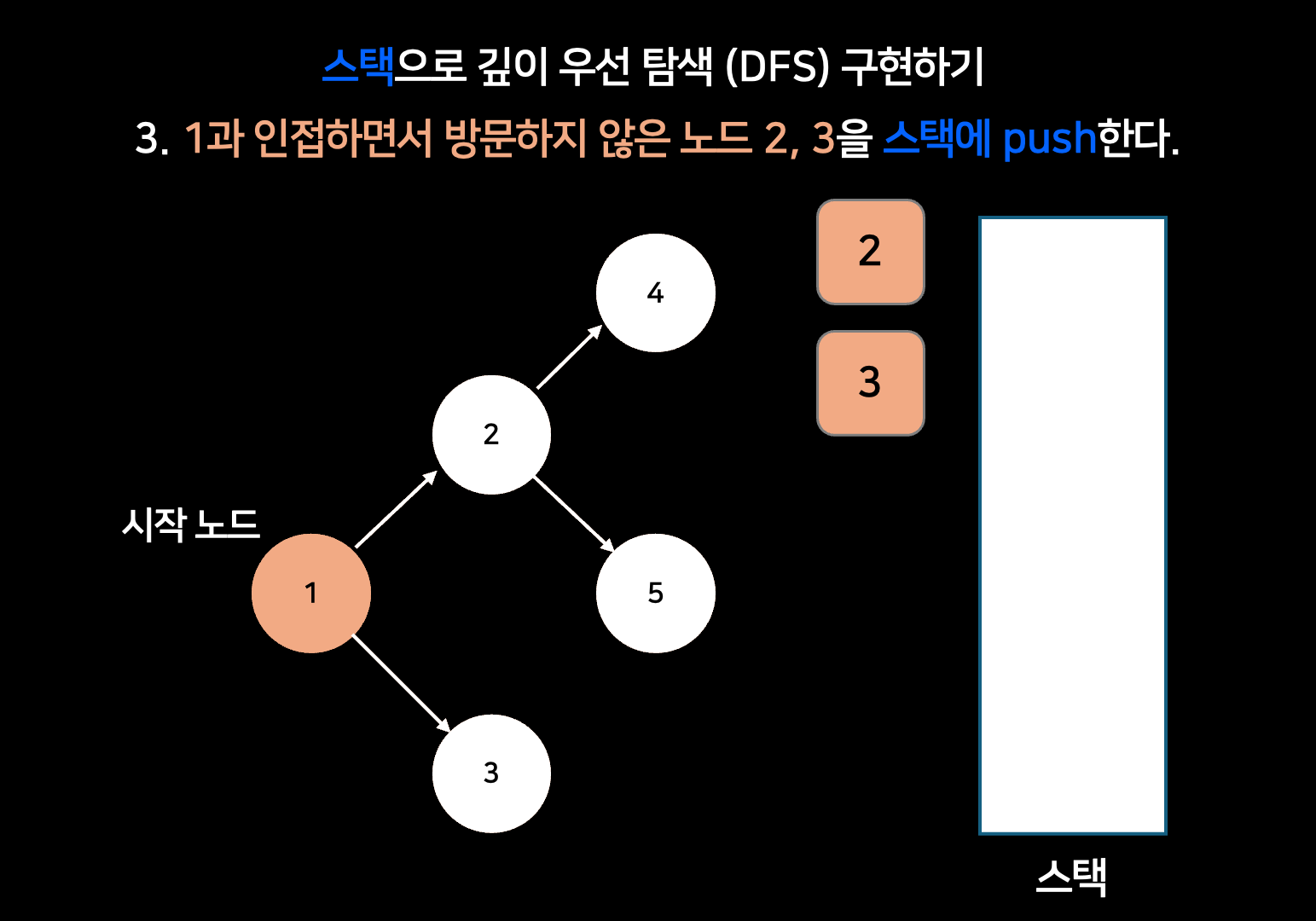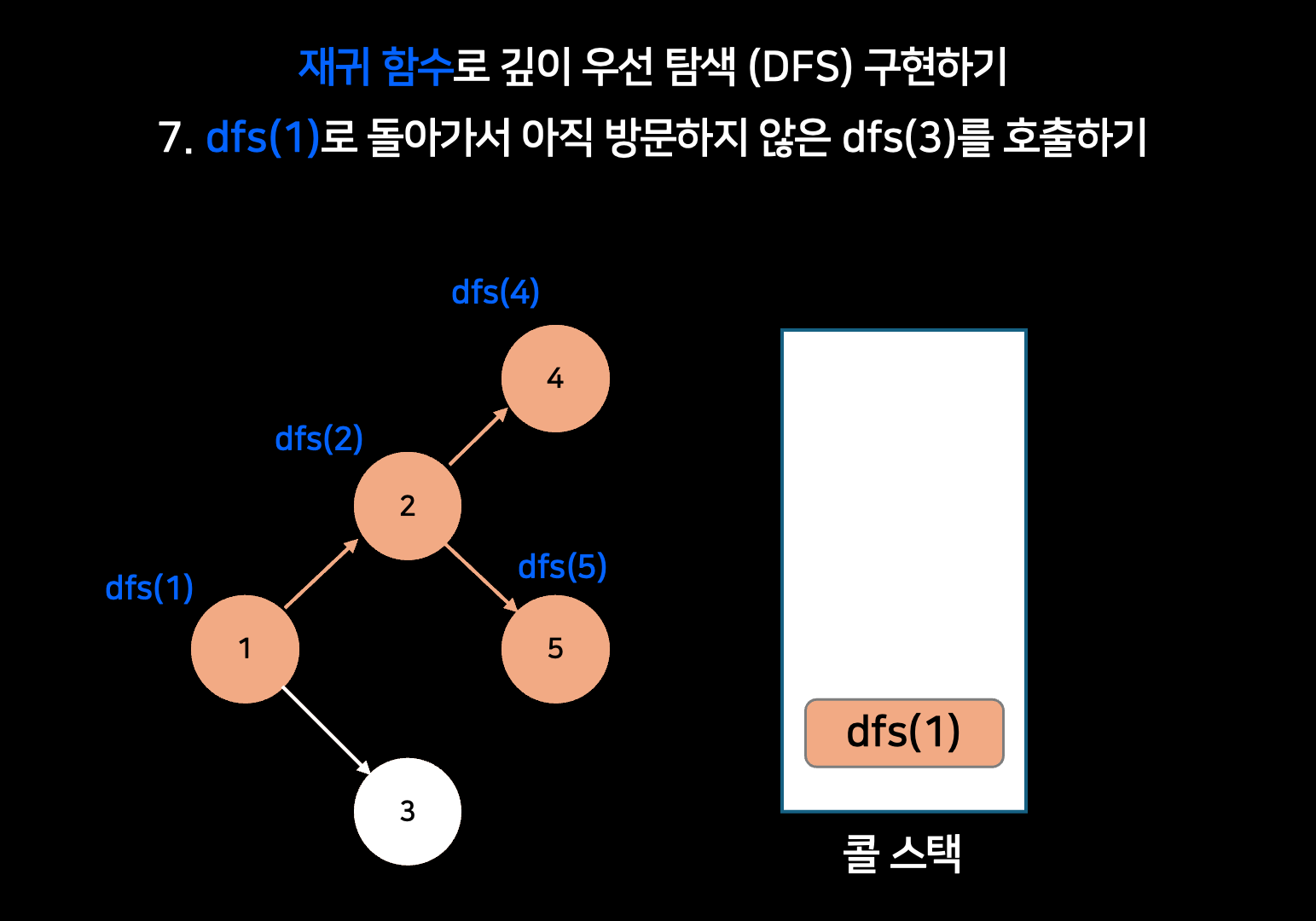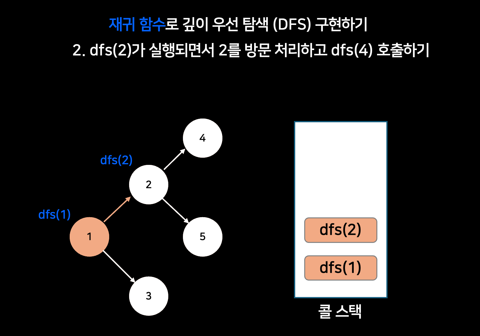 재귀 함수를 활용한 깊이 우선 탐색의 과정은 다음과 같다.