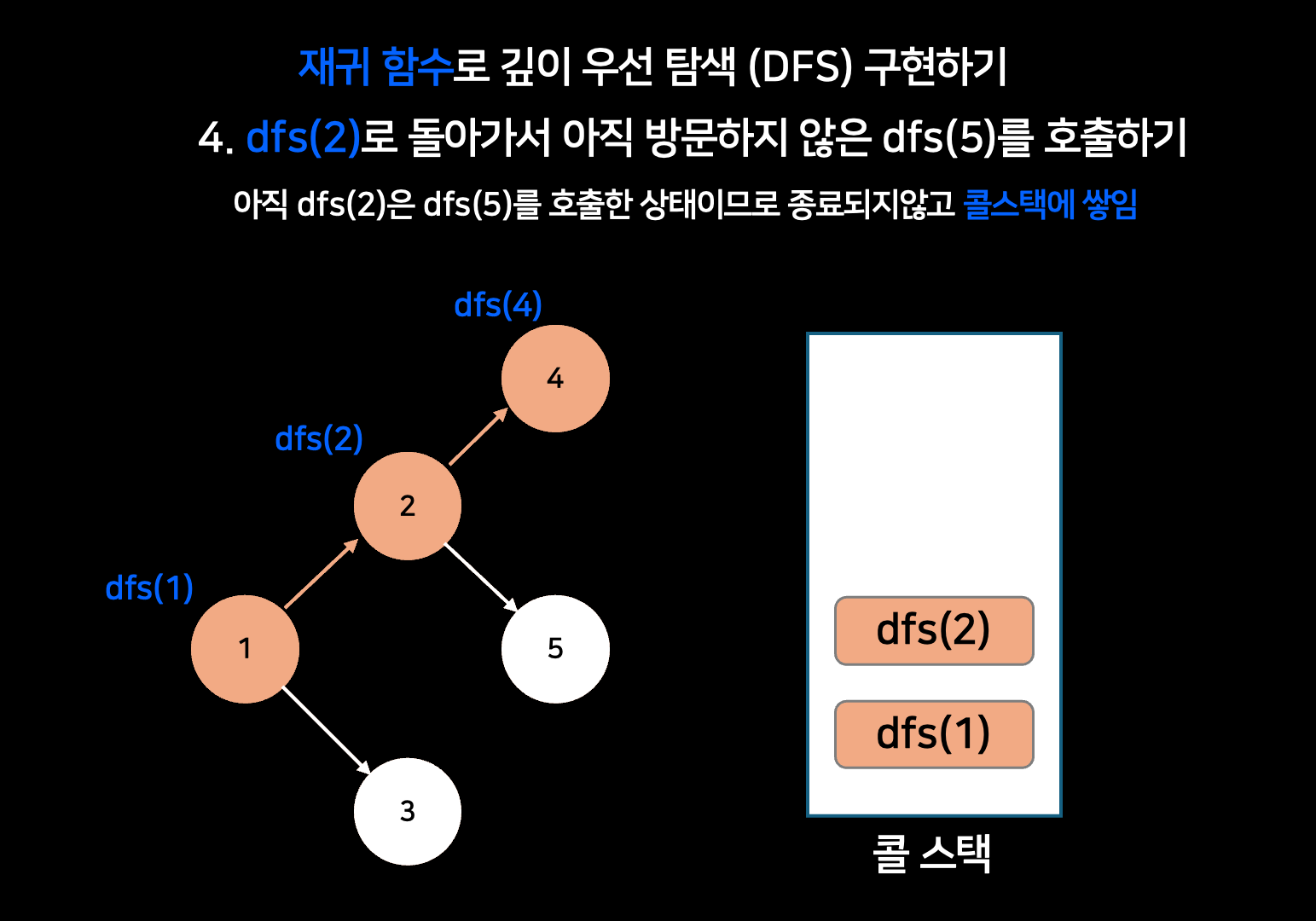 재귀 함수를 호출할 때마다 호출한 함수는 콜 스택(Call Stack)이라는 곳에 쌓이므로 깊이 우선 탐색에 활용이 가능하다