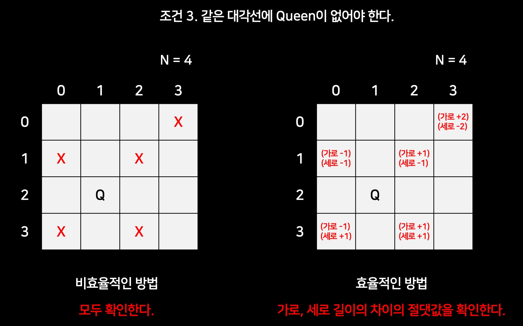 이미 알고 있는 가로와 세로의 길이를 통해 이전에 놓았던 Queen들이 대각선에 위치해있는지 확인할 수 있다.