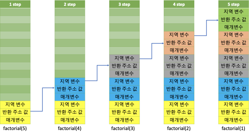 재귀 함수는 본인을 다시 호출함으로써 Stack 메모리를 사용하는데, 반복적으로 자기 자신을 부르면서 Stack에 게속해서 쌓여간다.