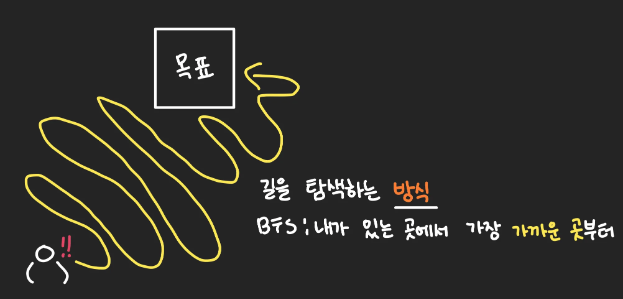 - BFS의 경우, 길을 탐색할 때 내가 있는 곳(시작지점)에서 가장 가까운 곳(상하좌우)부터 확인을 한다.