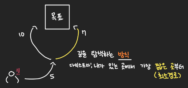 - 다익스트라의 경우, 길을 탐색할 때 내가 있는 곳(시작지점)에서 가장 짧은 깊은 곳(최소경로)부터 확인을 한다.