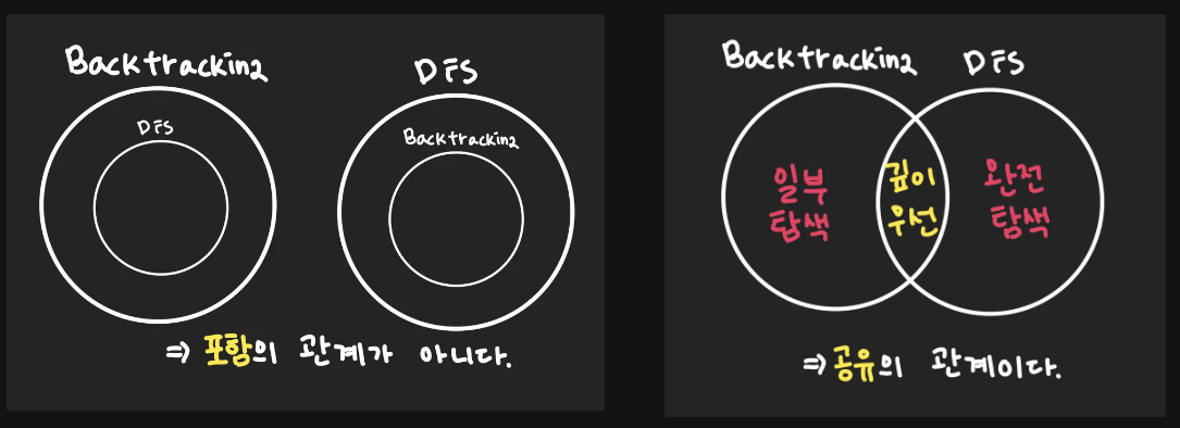 따라서 DFS, Backtracking은 상-하(포함)의 관계가 아니라 공유의 관계라고 보는 게 알맞다.