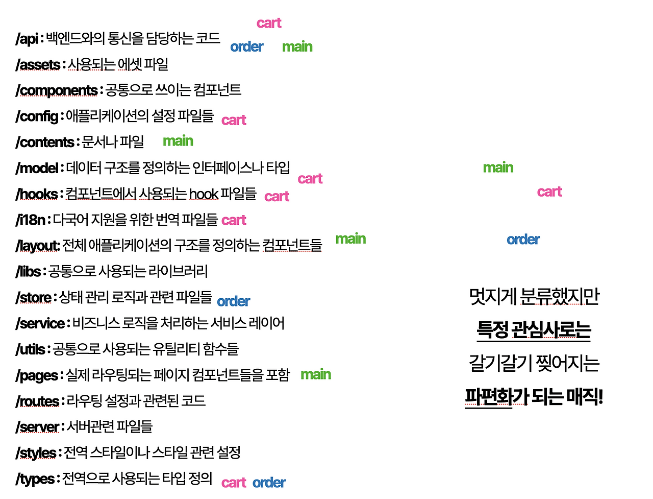 만약 main 기능을 바꾸려면 역할별로 나눠진 많은 파일들을 찾아가고 수정해야 한다. 어떠한 기능에 어떤 역할들이 사용되었는지 일일히 기록하고 기억해야한다는 것이다. 결국 '역할'보다는 '기능'별로 묶자는 의견들은 점점 커지기 시작하였고, 그래서 등장한 것이 바로 이 FSD 아키텍처이다. 역할을 기준으로 하여 구분하던 구조를 '기능'에 맞춰서 구분하려는 것이다.