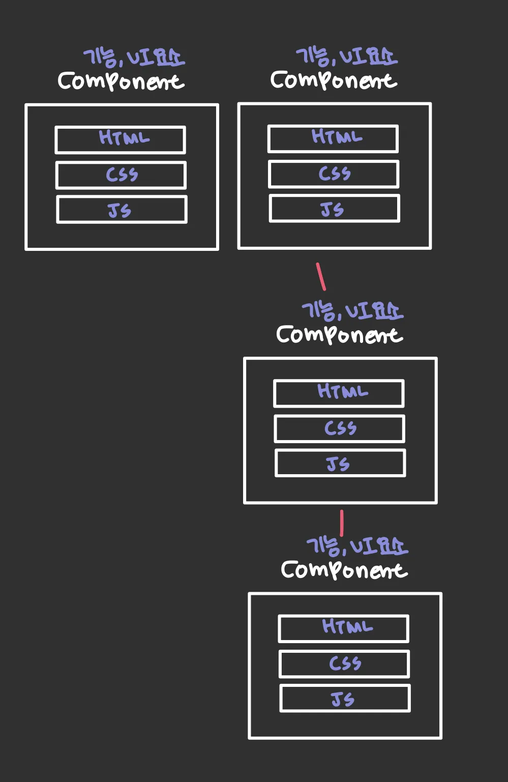 점차 Frontend가 해야 할 것들이 많아지면서 HTML + CSS + JS로만 구현되던 웹 페이지는 컴포넌트들의 조합이 되었다. HTML + CSS + JS로 만들어진 하나의 컴포넌트들을 쌓으면서 하나의 페이지를 만들 수 있어졌고, 다음과 같은 구조를 띄게 되었다.