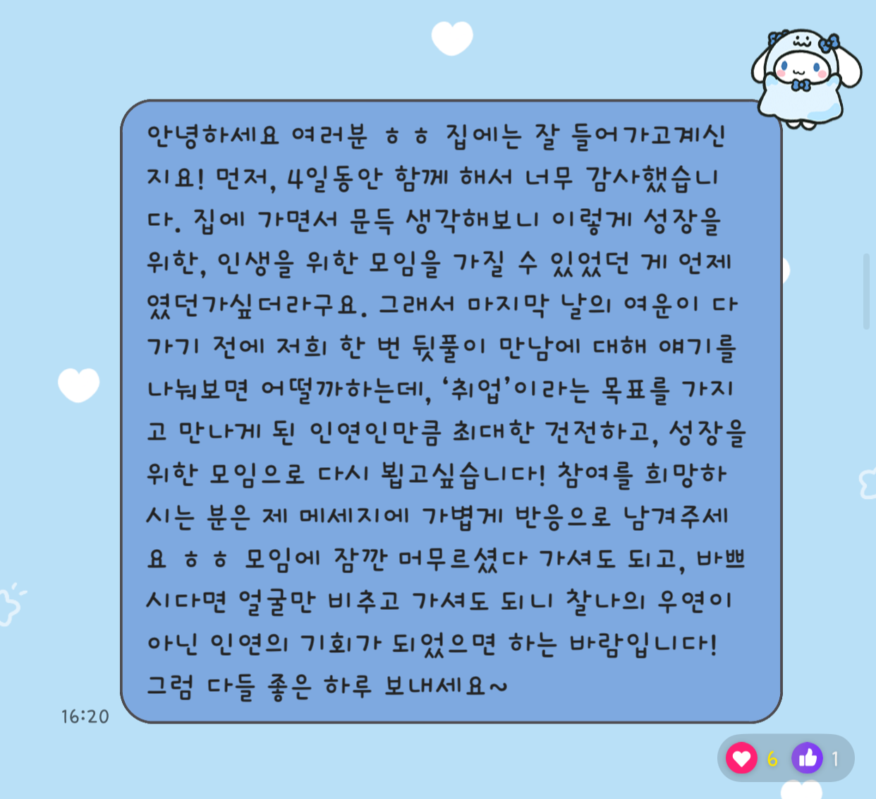 다들 MBTI 'I' 유형의 분들이라 'ENFP'(본인)의 텐션이 힘드셨을텐데도 잘 받아주시고, 말 걸어줘서 감사하다고 해주셔서 마음이 따뜻해져버렸당...그래서 결국 참지 못하고, 단톡방에 앞으로의 만남을 주선하고픈 메세지를 올렸고 감사하게도 나 포함 6명의 응답이 있었다! 앞으로도 꾸준히 만나서 서로 정보와 근황을 공유하고 응원해줄 수 있는 긍정적인 모임으로 이어가기를 바라는 마음이다 ㅎㅎ 이번 포스트 끗!