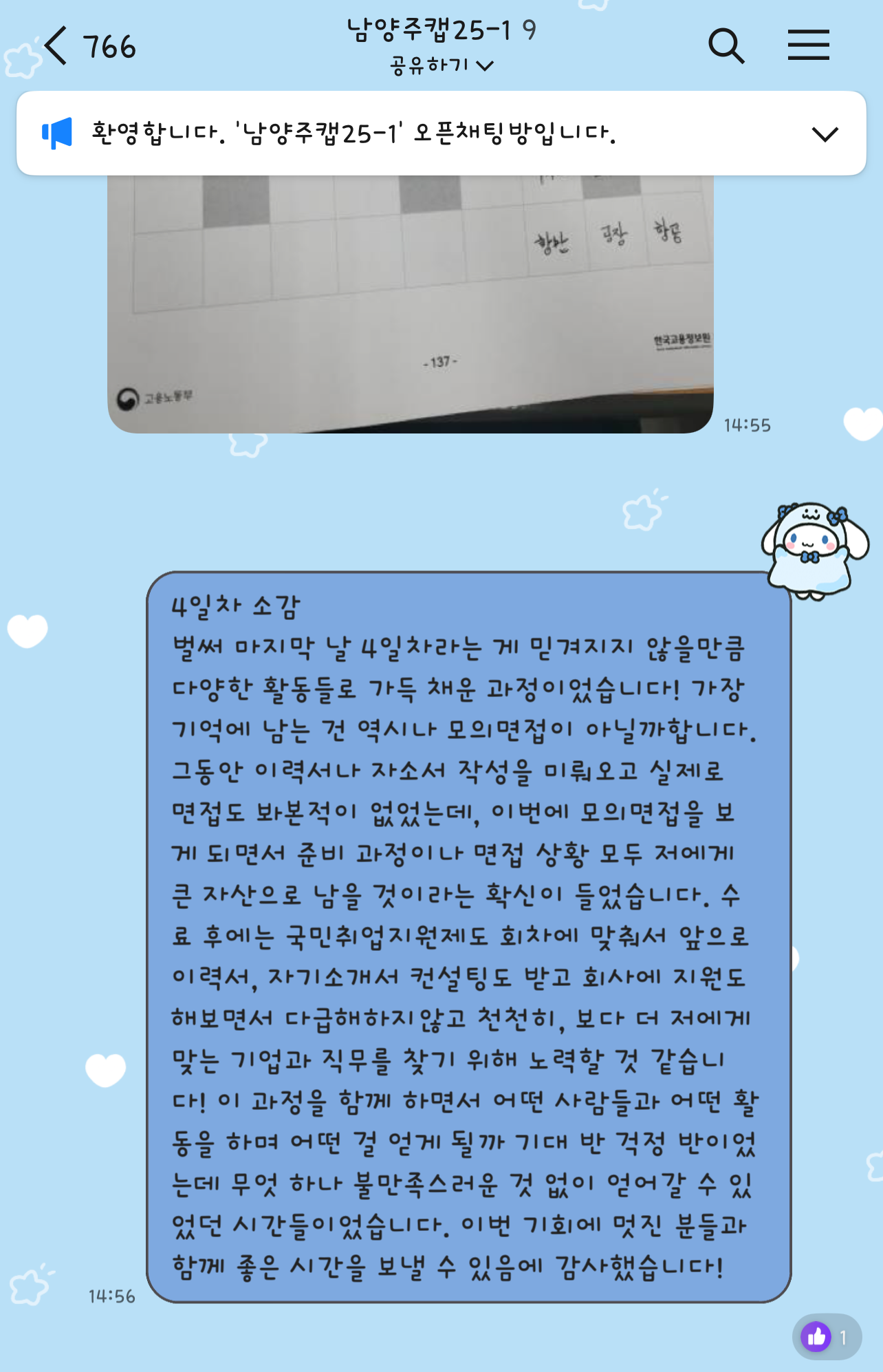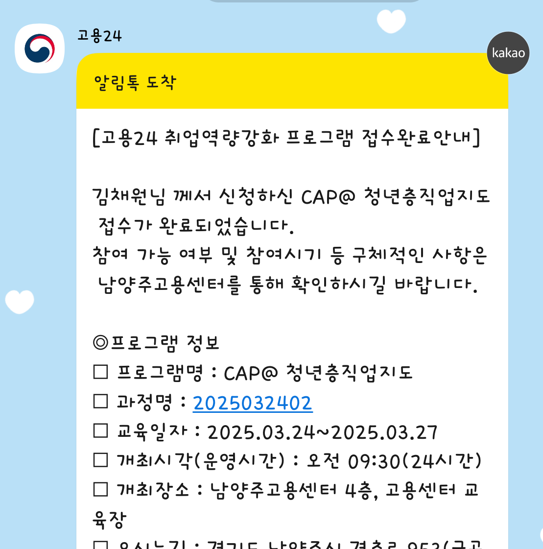 집단 상담이라고 해서 매 주마다 2~3시간씩 만날 줄 알았는데, 연속 4일동안 6시간씩 듣는 프로그램이었다! 아무래도 국취제에서 활동 인증이 되는 프로그램이었기때문에 24시간의 교육시간이 필요해서였던 것 같다. 월화목금 야간알바를 하고 있는 나에게 꽤나 도전적인 일정이었다... (어떻게든 되겠지 라는 생각..?) 그 이후 고용센터에서 한 번 더 참여를 묻는 연락이 왔고, 주말에 강사님에게서 최종 참여 확인 문자를 보내서 참여를 확정지을 수 있었다.