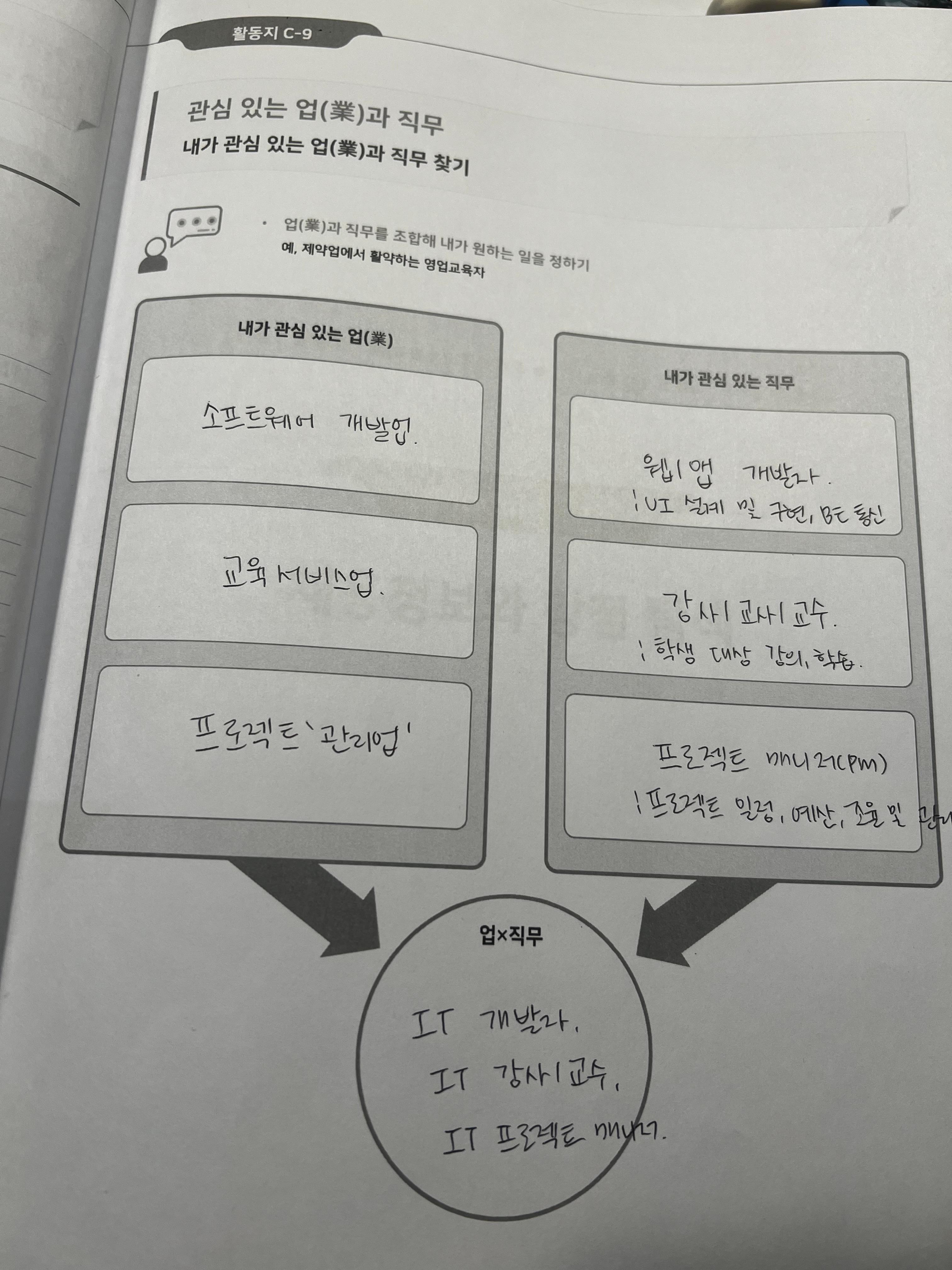 오전에는 전반적으로 다양한 업과 직무를 알아보고 나에게 맞는 업/직무를 찾아보는 개인 활동을 진행하였다. 나는 'IT 개발업', '교육서비스업', '프로젝트 관리업'에 관심이 있었고, 직무에는 '개발자', '강사/교수', '프로젝트 매니저'에 흥미가 있다는 것을 알게 되었다.