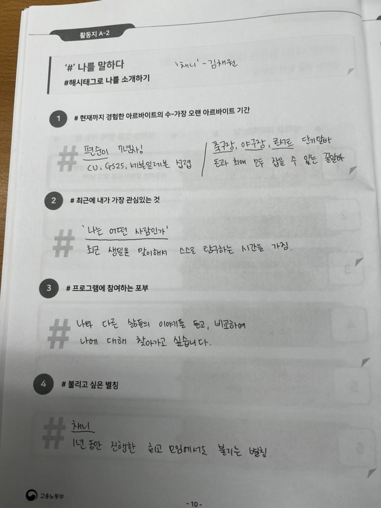 꽤 두꺼운 책이라, 처음부터 끝까지 살펴보고 있던 중에 함께 교육 프로그램에 참여할 9명이 모두 도착했다. 강사님은 노련한 말솜씨로 환영 인사와 함께 어색한 분위기를 풀 수 있는 간단한 얘기들을 해주셨고, 프로그램을 앞으로 어떻게 진행할 건지에 대한 설명을 해주셨다. 이후로는 참여한 사람들끼리 인사를 할 수 있도록 해시태그를 통해 '나'를 소개하는 활동을 하였다. 워크북을 활용한 모든 활동들은 사진을 찍어서 단톡방에 전송을 하여 너무 편했다!