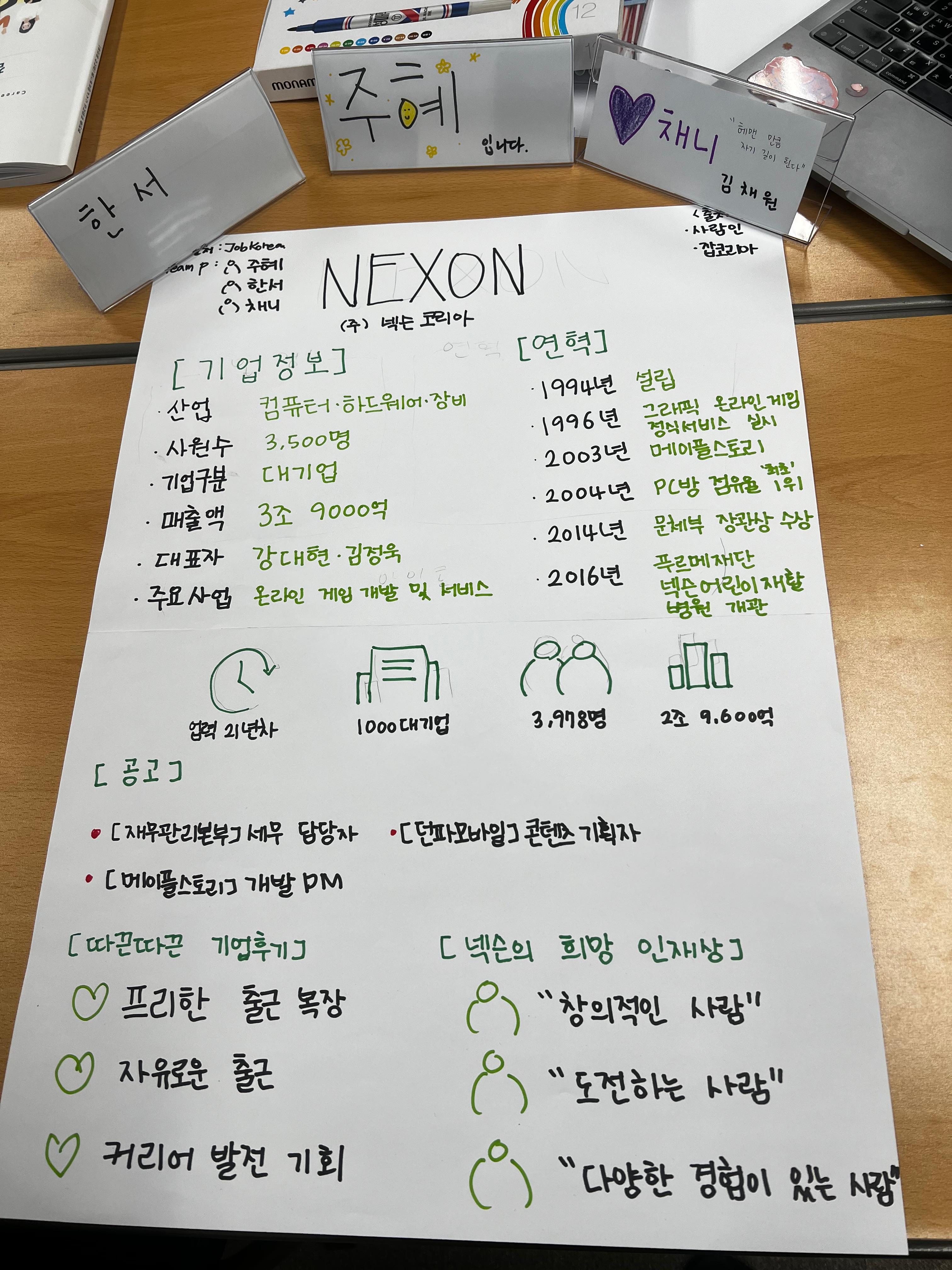 오후에는 기업에 대해 분석하고 발표하는 팀 활동을 진행하였다. 단 20분이라는 시간 안에 조사와 발표 자료 작성 및 발표 준비까지 해야 하는 활동이라 열심히 집중하고 계속 대화하며 해나갔다. 먼저, 어떤 기업을 위주로 분석해볼까 얘기를 나눴었는데 쉬는 시간에 3명이서 가장 많이 나눴던 대화 소재가 '게임'이었고, 팀원 중 한 분께서 '게임 기획&UI/UX 디자인'에 관심이 있으셨기에 대기업 NEXON으로 정하였다. 가장 정보가 많고, 사람들에게 흥미를 끌기에 좋은 기업이라고 생각하였다. 사람인과 잡코리아를 보며 정리하였고, 둘의 정보가 달랐지만 이 또한 발표에 녹일 수 있을 것 같아서 그대로 진행하였다. 다른 팀들에 비해 우리 팀만의 특이 사항이라고 한다면, '공고'에 대해 알아보고 정리하는 것이었는데 '취업'을 위주로 만난 프로그램인만큼 각자 원하는 직무로 갈 수 있는(희망사항) 공고에 대해 찾아보고 발표했던 것이 무척이나 재밌었다. 나는 '발표 자료 작성'과 '발표'를 맡았었는데 '자료조사'를 확실히 해준 팀원들 덕분에 믿고 바로 발표를 할 수 있었다. 오랜만에 사람들 앞에서 하는 발표라 재밌었다! 그래서 개인적으로 가장 재밌었던 활동 중 하나이다!