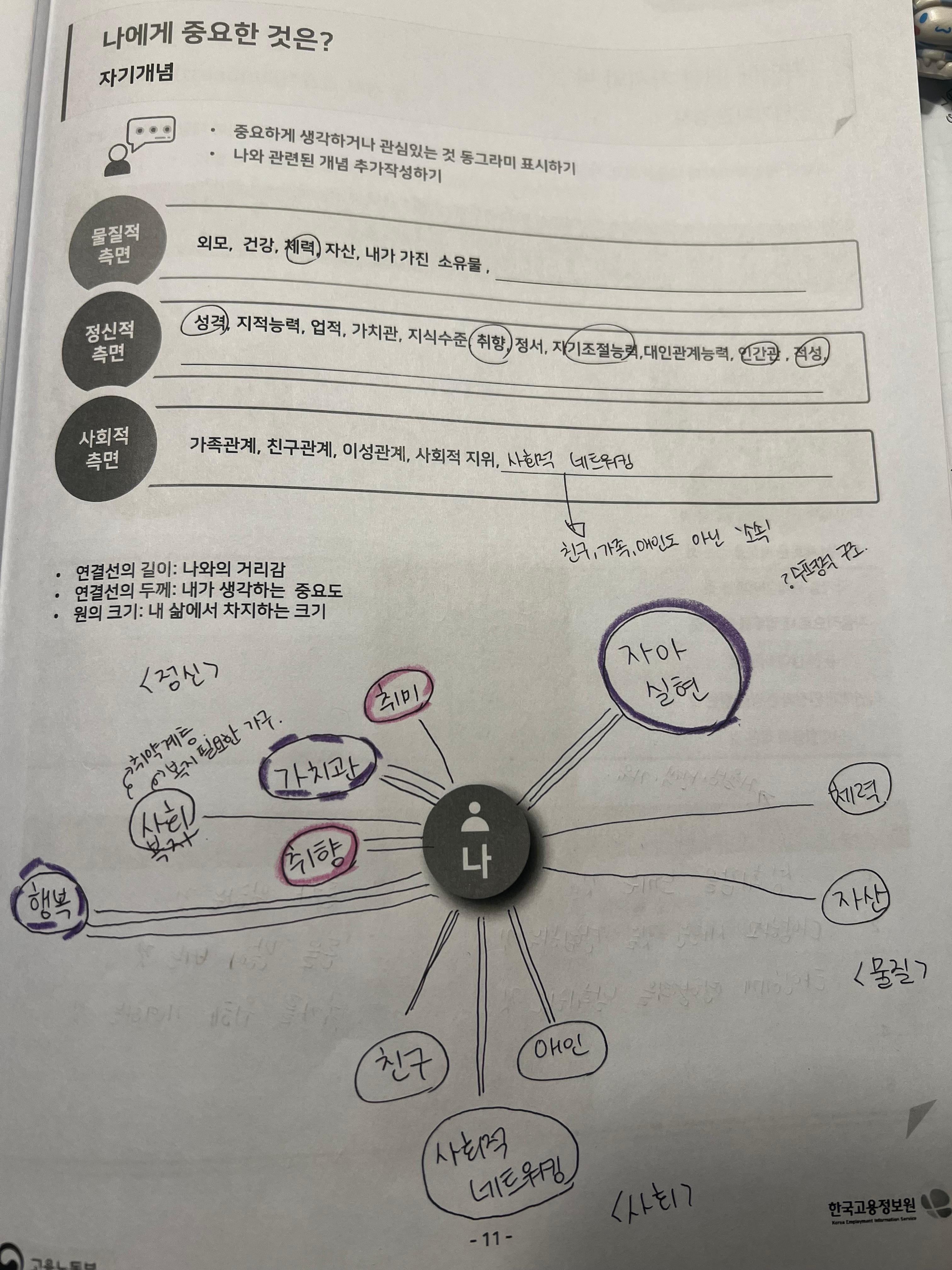 물질적, 정신적, 사회적으로 어떤 가치들을 중요시하는 지에 대해서도 작성해보았는데, '자아실현', '행복', '가치관 확립'이 나의 주가치였다. 이미 알고 있었지만 원의 크기, 선의 두께, 선의 길이 등으로 보기 좋게 나누고나니 내가 어떤 가치를 중요시여기며 살아왔는지가 잘 보였다.
