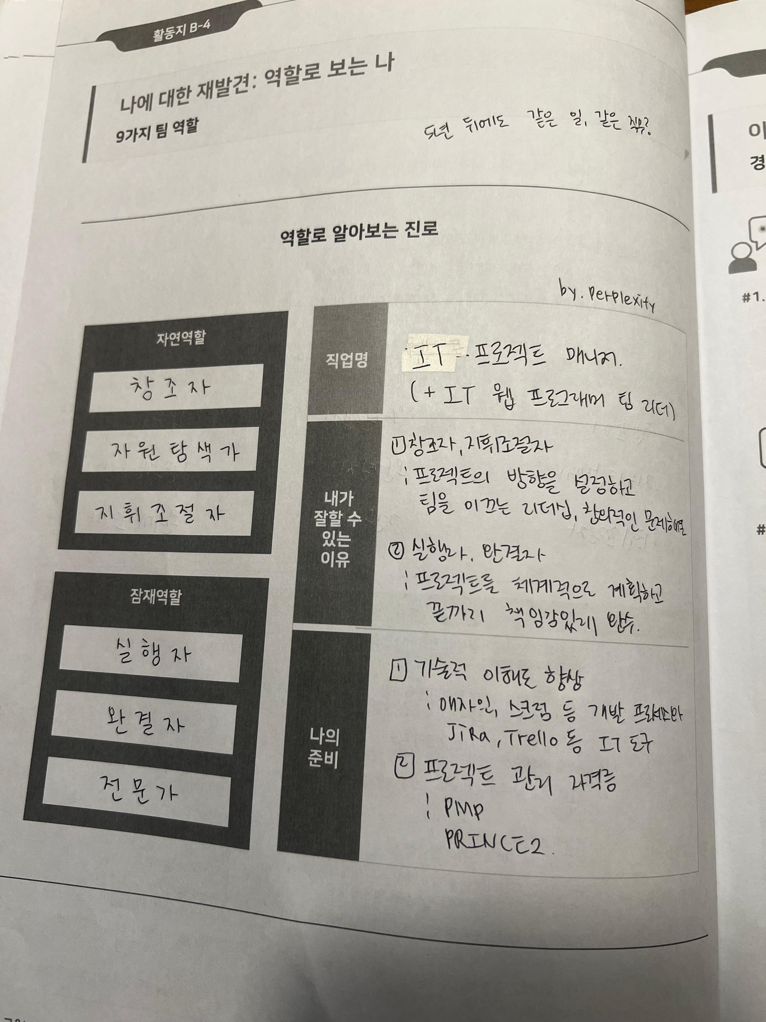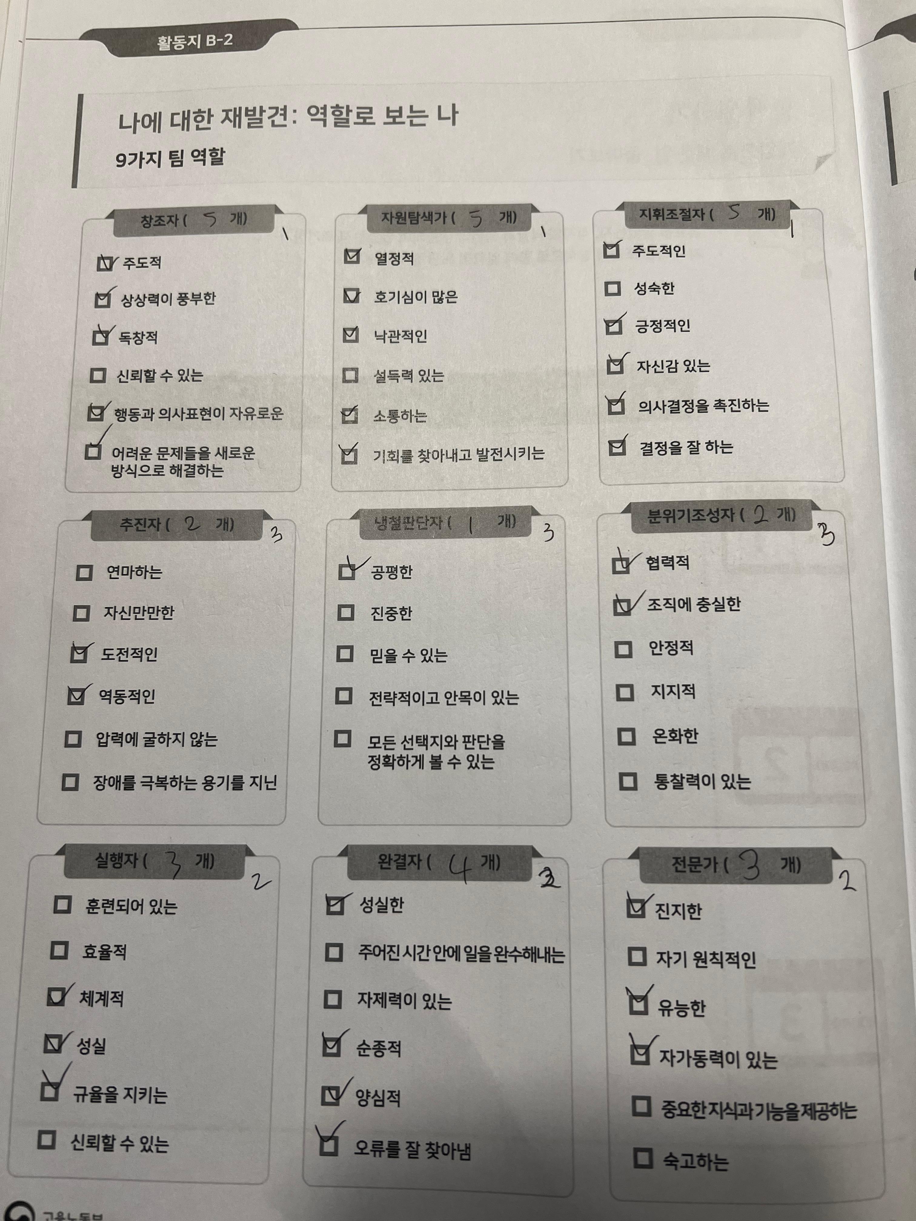 점심을 먹고 온 뒤 오후 시간 첫 활동은 '역할로 보는 나'였다. 총 9가지 역할에 관해서 나에게 맞는 듯한 성격, 성향을 체크하여 높게 나온 것들을 위주로 자연 역할, 잠재 역할, 비선호 역할을 나누는 활동이었다. 나의 역할들은 다음과 같다.