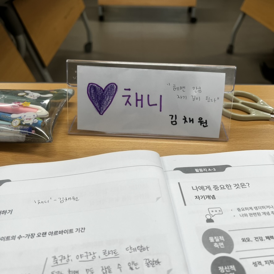 3월 24일 월요일, 프로그램 첫 교육일이 되었다. 9시 30분 시작이지만 미리 준비하기 위해 9시 넘어서 고용복지센터에 도착하였다. 도착하니 강사님께서 맛있는 다과와 함께 책상을 이미 배치해놓으셨고, 책상에는 한 책자가 있었다. 앞으로 4일동안 고용복지센터에 두고 작성하다가 마지막 날에 가져가는 활동용 워크북이었다.