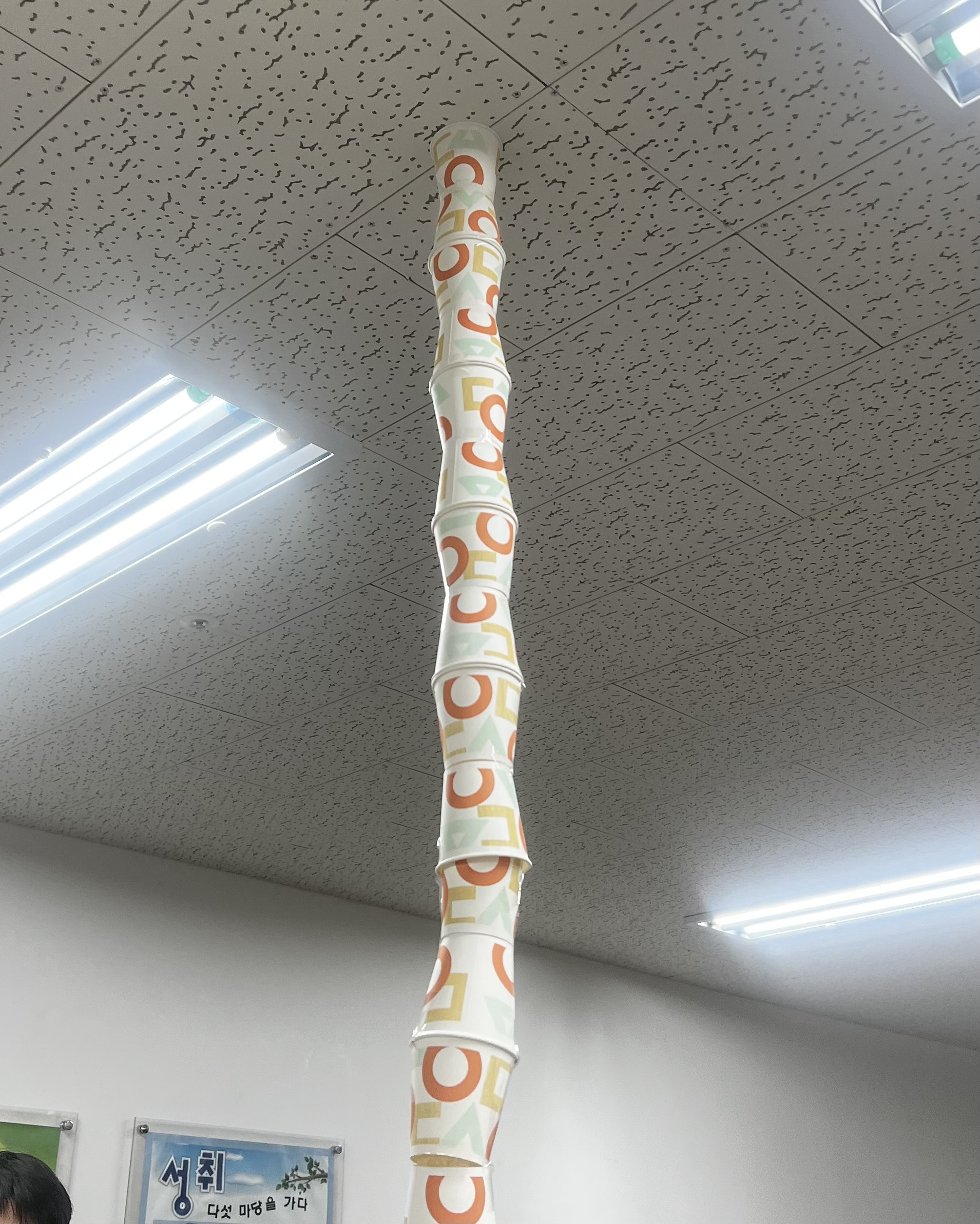 1일차 마지막으로는 팀끼리 종이컵, 테이프, 종이를 가지고 가장 높게 쌓는 게임을 했다. 다른 팀들은 피라미드 형식으로 쌓았지만, 이를 보지 못하고 우리 팀은 일자로 쌓아서 천장에 붙여보자! 라는 전략으로 진행하였다. 누구 하나 태클 없이 손발이 착착 맞아 빠르게 높게 쌓을 수 있었다 비록 조금 위태하여 종료 후 몇 분 뒤에는 무너졌지만 단시간에 딱 원하는 정도의 결과와 성취를 얻을 수 있었던 재밌는 활동이었다. 팀원 두 명 모두 딱 '실행자', '완결자', '분위기조성자'가 높게 나온 분들이라 협력하기에 최고였던 팀 조합이었다!