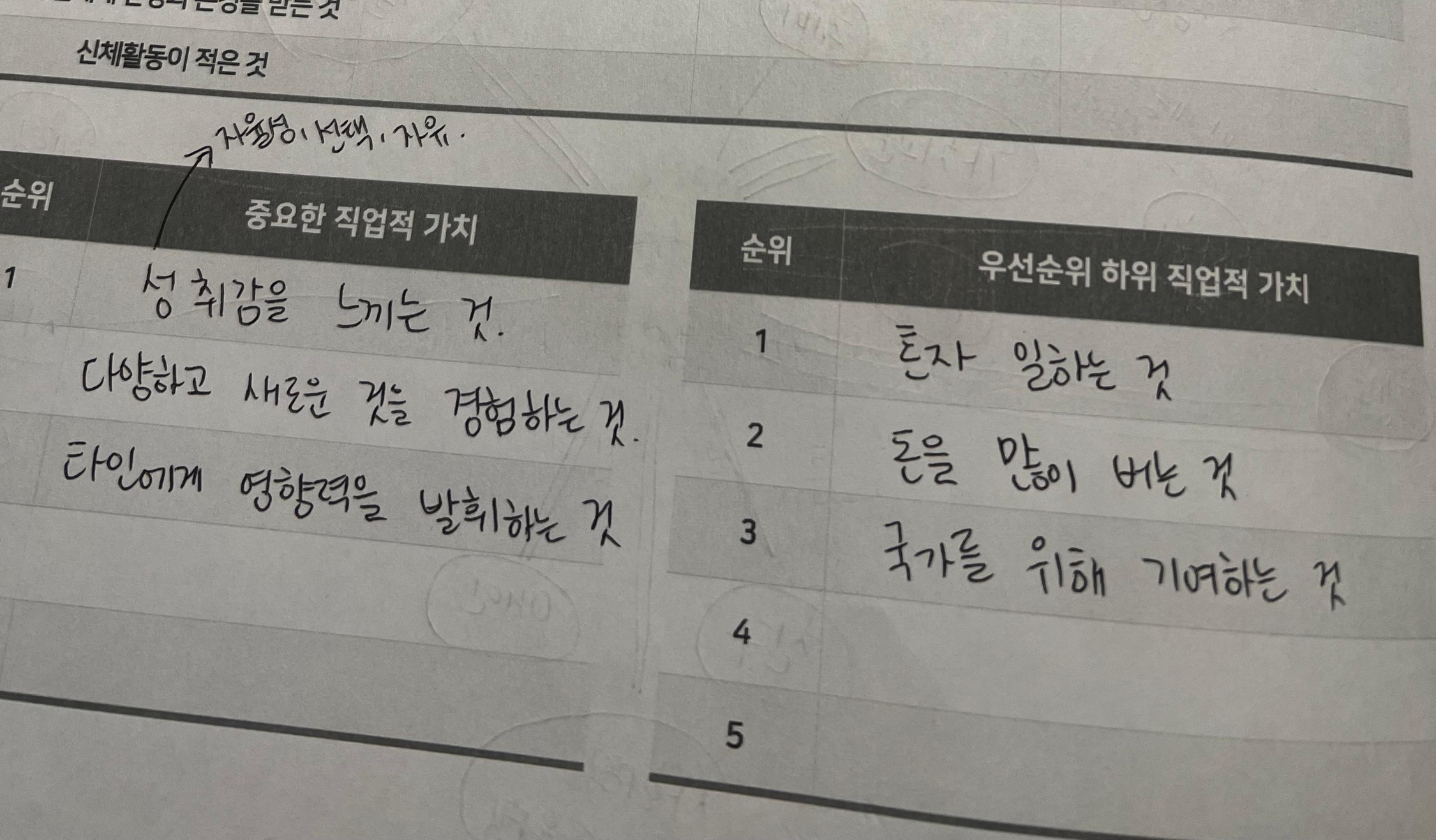 여러 직업적 가치 중에서 내가 중요하게 생각하는 가치 3가지와 그렇지 않은 가치 3가지를 선택해보았다. 그동안 여러 기회들로 스터디와 프로젝트들을 운영하거나 참여하였을 때 느꼈던 것이지만 나는 일을 함으로써 '해냈다', '잘했다'라는 성취감을 느끼는 것이 가장 중요하고, 한 가지 분야에만 국한되어있거나 한 가지 방식으로만 행해지는 일보다는 다양하고 새롭게 경험할 수 있는 일을 좋아하는 것 같았다. 마지막으로는 누군가에게 알려주고 가르침으로써 그 사람이 새롭게 배우는 것이 느껴지는 게 만족스러웠다.
