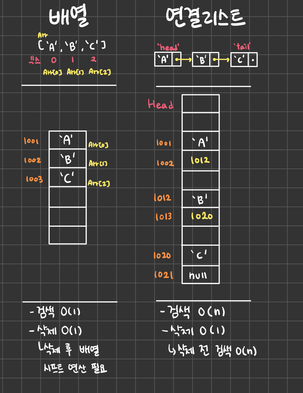 인덱스를 사용하기에 Arr[1] 와 같은 명령으로 검색에 O(1)의 복잡도가 드는 배열과 달리